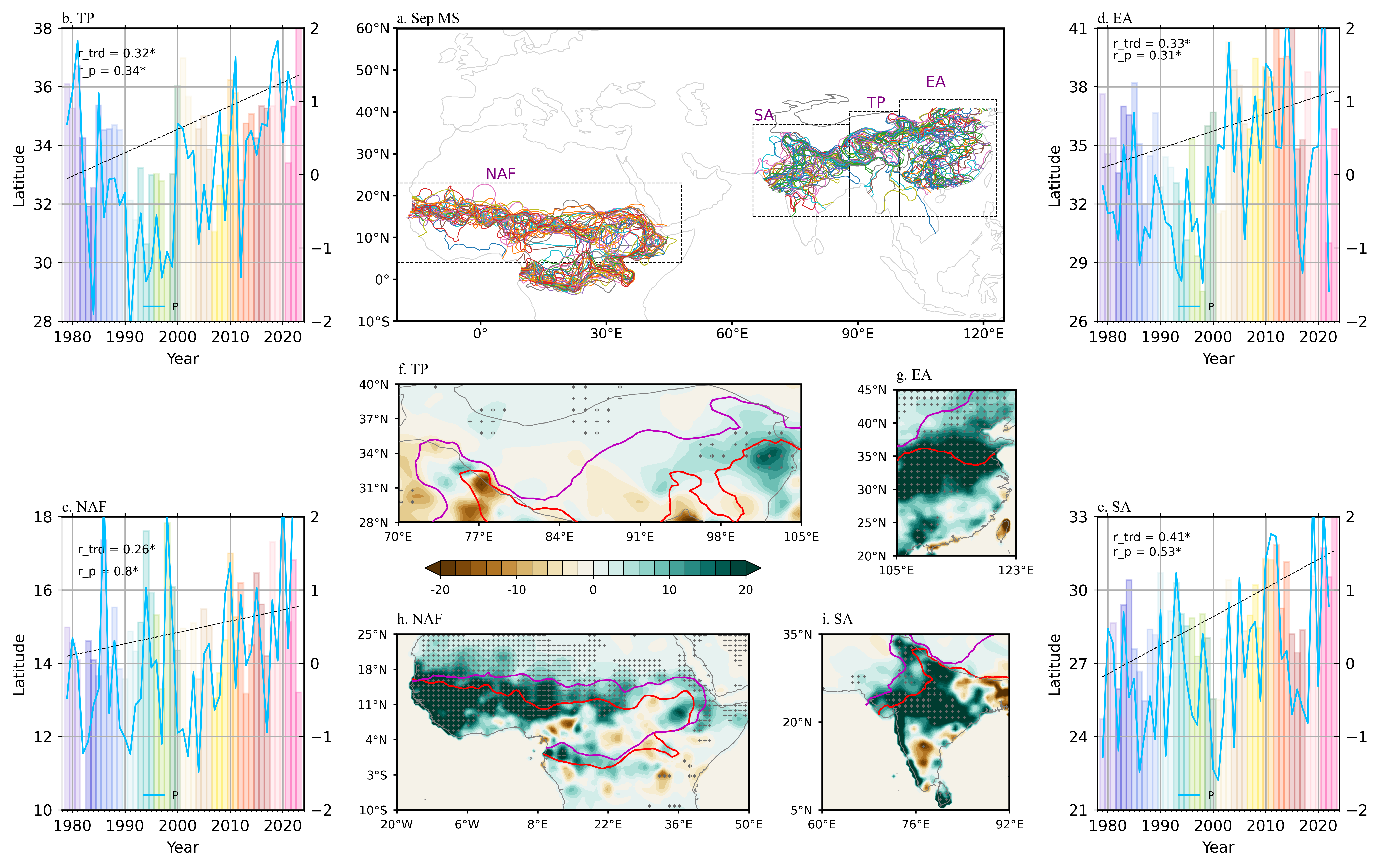 图2. 1979-2024年季风北界(MSI)与9月降水变化的关系。(a) 1979-2024年9月的MSI分布。(b-e) 对应(a)中四个季风区NAF、SA、TP、EA 9月MSI序列(柱状)与标准化降水指数序列(蓝线)。(f-i) 标准化MSI回归的 9月降水(mm),图(f-i)中粉色与红色线和灰色点同图1。