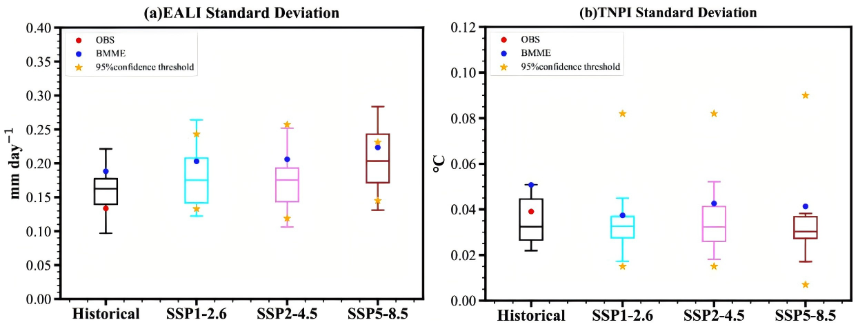 图1. 观测(红点)和模式(蓝点)历史模拟和不同排放情景下未来预估的(a)东亚夏季风陆地降水、(b)热带及北太平洋海温指数的年代际强度的散点图。