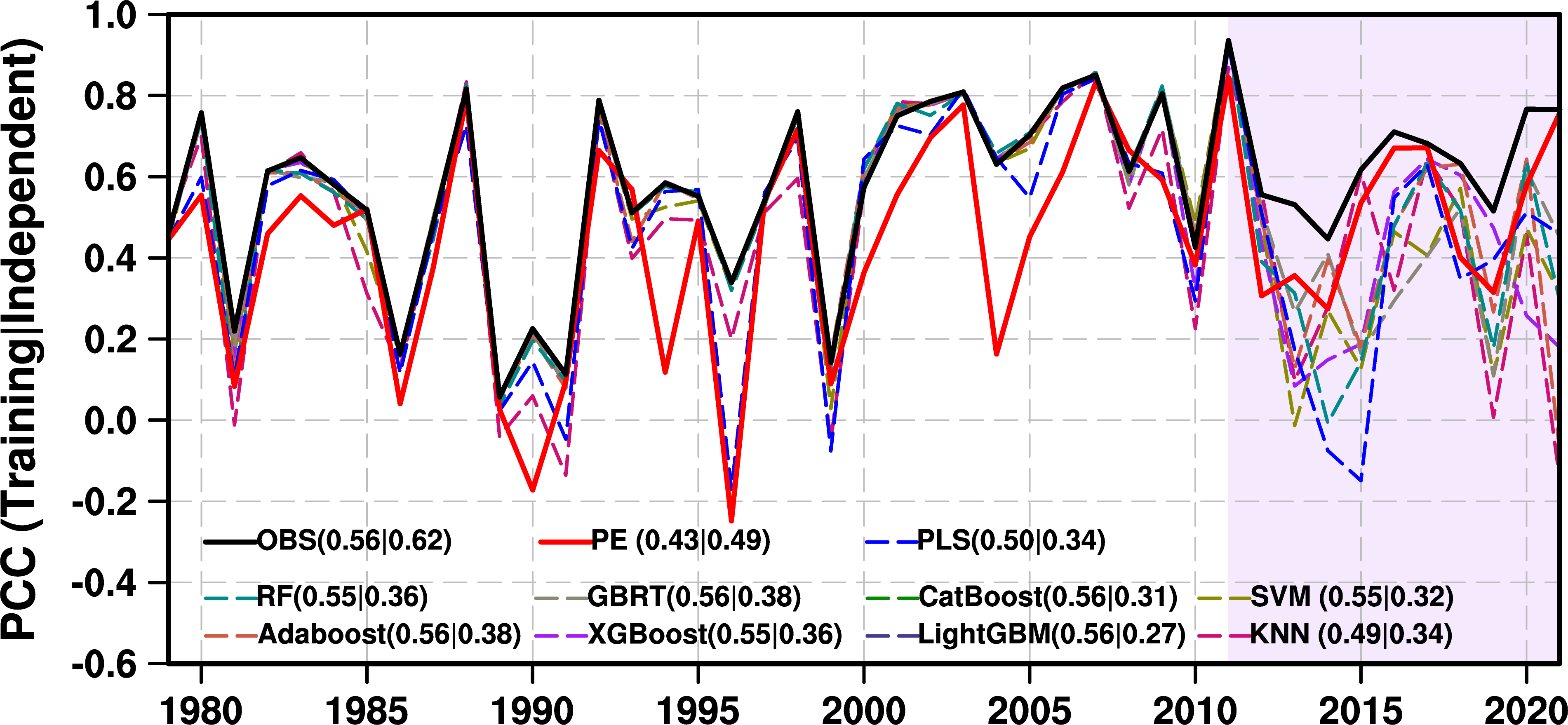 图1 观测PC、物理机制模型、纯统计模型和机器学习模型预测PC重构的北美西部夏季极端高温日数PCC技巧。括号中分别为训练期和独立预测期平均的PCC技巧。
