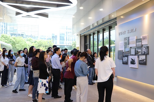 首先,大家参观了位于江北新区基因大厦云书房。这是由江北新区和凤凰传媒集团共同打造,致力于为青年人打造集休闲、交流、学习多功能于一体的党建文化创意空间。云书房践行“联结共享”理念,以相关文化交流活动和衍生服务作为吸引读者的重要抓手,在全国率先将云概念与书籍查询、借阅服务进行整合,创新实行“1+N+X”模式;馆藏累计超过500万册,可线上阅读线下借阅。为强化党史知识学习,云书房专门在入口处设置了展示区,从“星星之火,闪耀江畔”到“天翻地覆,奋斗发展”,让大家了解了江北新区的过去和现在,感受到在党的领导下新区的发展速度和创新活力。