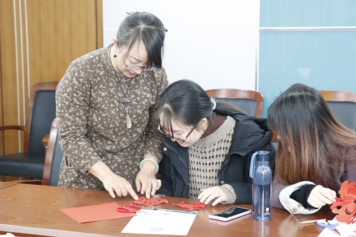 学院辅导员老师刘伟带领大家参与本次主题剪纸活动。刘伟老师本科主修艺术设计,热爱中国传统文化艺术,有丰富的艺术课程教育经验。活动开始,刘老师介绍了非物质文化遗产剪纸艺术的发展过程以及团花剪纸的艺术表现形式。随后,她为大家展示速剪技艺,引得同学们连连惊叹。接着,刘老师展开细致的剪纸教学,从折叠到描绘月牙纹、柳叶纹、毛刺纹等装饰花纹,再到最后的剪纸,指导同学们完成了精美的团花剪纸作品。