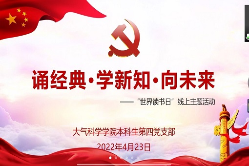 为营造爱读书、读好书、善读书的浓厚氛围,引导党员同志提升阅读兴趣、养成阅读习惯、提高阅读能力,夯实学院学风建设,大气科学学院本科生第四党支部结合第27个“世界读书日”,于4月23日上午线上开展了“诵经典·学新知·向未来”主题党日活动。