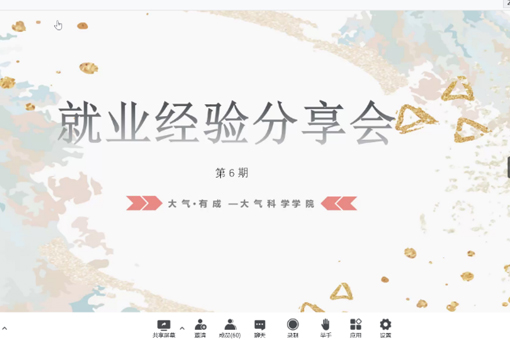 为进一步帮助我院2019级本科生做好毕业规划,全面了解就业形势,拓宽就业途径,畅通信息沟通渠道,大气院于5月27日晚举办第六期“大气·有成”就业经验分享会,邀请选调生缪承志、研究生支教团党团支部书记陆秋鸣和苏北计划志愿者任天艺这三位学院的优秀校友结合自身职业选择、求职备考与工作经历进行分享,分享会由2019级辅导员邹东明老师主持。