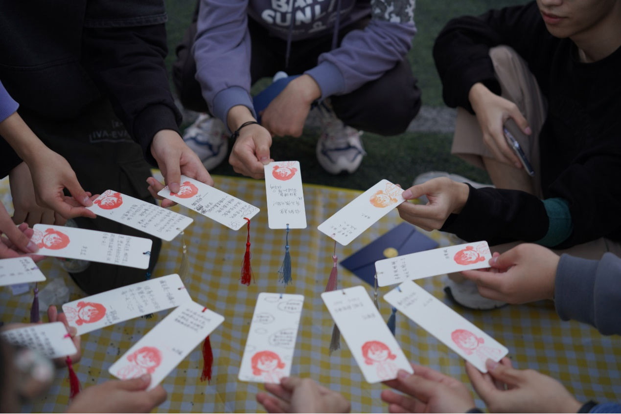 活动在破冰游戏中拉开帷幕,通过“拾树叶”“三人四足”“慢骑自行车”“刻在秋天的颜色”等游戏,同学们之间的距离逐渐拉近,默契度越来越高,现场气氛逐渐活跃。随后,刘伟老师和同学们一起互动交流,分享大气院的学习和生活,并建议大家提前做好就业规划。最后,刘老师将亲手制作的书签送给同学们,大家在精心制作的书签上,认真写下对同学的美好祝福,每位同学随机抽取一份书签,并和身边的同学分享收到的祝福,现场温情暖暖。