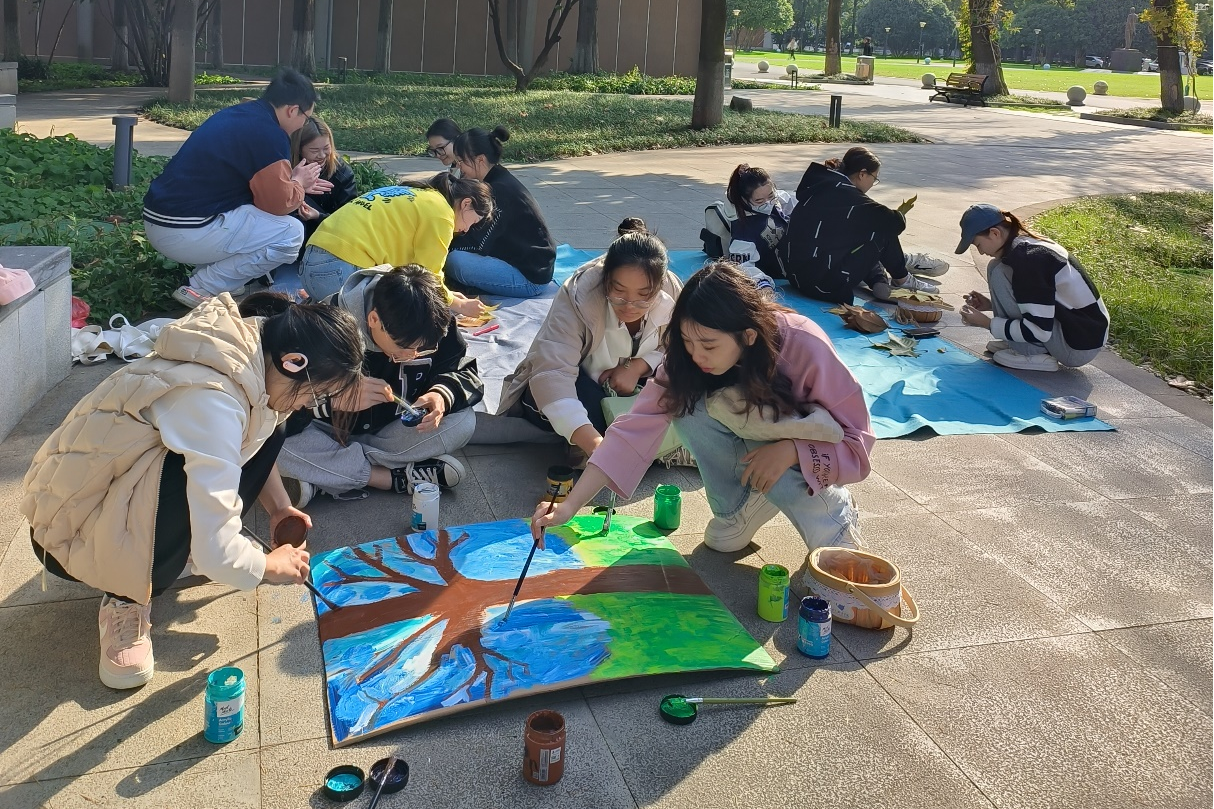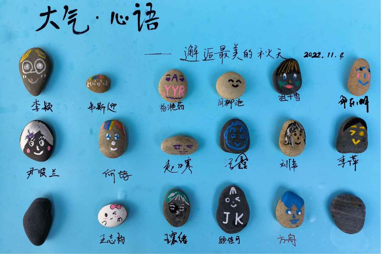 活动伊始,同学们首先用亲手绘制石头头像作为特别的“签到表”进行签到。接着,刘老师带领大家漫步校园,通过在落叶上打孔来发现平时注意不到的美好景致。活动中,同学们欣赏到了独特的信大秋色,捡拾了许多花纹漂亮、颜色奇妙的落叶。随后,刘老师带领同学们参与树叶想象、树叶绘画、树叶吹泡泡等活动,在欢声笑语中,与秋色撞个满怀。
