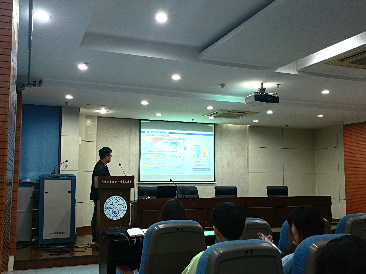 2021级硕士研究生许天宝以《“暖北极-冷欧亚”气温型季节预测》为题作报告,研究了与“暖北极-冷欧亚”相关的地面气温经向梯度与中低纬度气候异常和极端天气的关系,发现预测良好的GradTAE在“暖北极-冷欧亚”大尺度预测中具有一定的应用价值,并有可能提高中国东部地区地面气温的预测技巧。