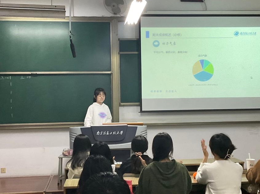 班会中,学习委员陈镜悦同学以数据和图表的形式直观展示了班级同学上一学期的学习成果,梳理了大家大学生英语四级、六级,计算机等级考试以及专业课学习等的通过情况;并结合学生手册上相关内容,再一次向全体同学强调了毕业要求、学位授予条件等。希望全体同学能够珍惜时间,一起努力,共同取得更大的进步。