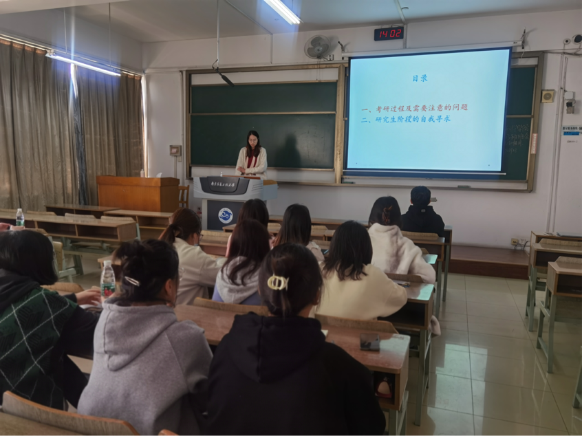 活动开始,郑帅对上学期班级总体情况做了详细总结,他指出优良的学风需要每一位同学的努力,希望大家新学期再接再厉,并提醒大家在学习的同时关注身体健康,保持积极向上、乐观开朗的心态。接着,2018级薛茹帆学姐和大家分享了考研备考经验。针对考研,她详细讲述了备考期间每个月的复习计划,分享复习时使用的网课、书籍,鼓励大家要平衡学习与生活,早准备、有计划地备考,注重转换学习和思维方式,劳逸结合。活动最后,辅导员刘伟老师结合专业特点,和大家分享就业的方向,指导大家如何关注就业信息并积极提升就业竞争力,建议同学们根据自己的实际情况选择未来方向。