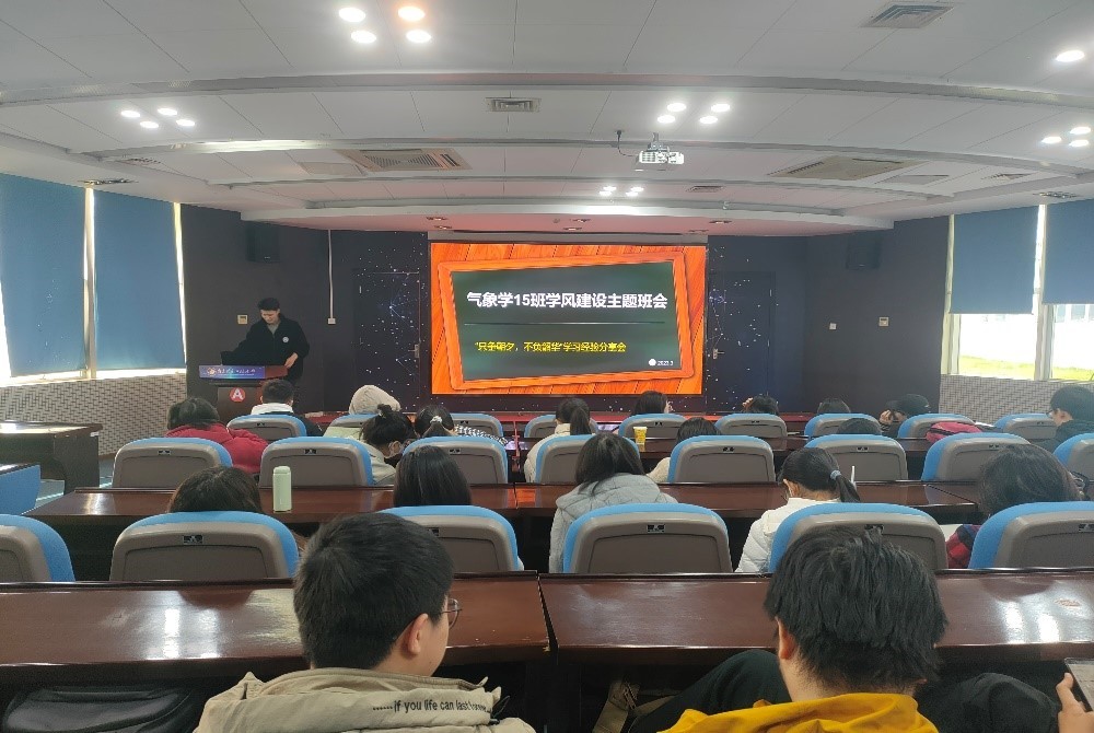 为响应学院号召,增强同学们对学风建设的认识,提高同学们学习的积极性,提升学风建设的成效,3月14号上午,大气科学学院2020级15班在培训楼101报告厅开展了“只争朝夕,不负韶华”学风建设主题班会。班长吴宇翔主持,班级全体同学参加。