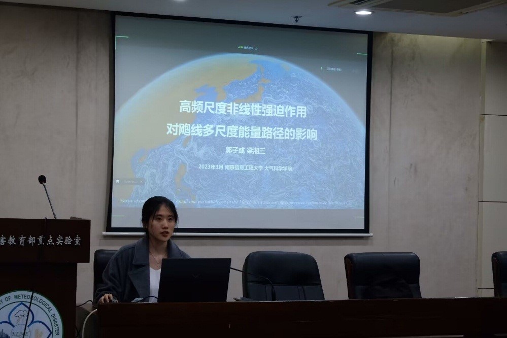 2020级博士研究生孙晓岩报告主题是《On the Localized Extreme Rainfall over the Great Bay Area in South China with Complex Topography and Strong UHI Effects》,报告围绕粤港澳大湾区局地极端降水事件,研究了该事件的对流和天气背景基本特征,城市化、地形及海风的影响。2020级硕士研究生郭子彧以《Nexus of ambient flow and squall line via turbulence in the March 2018 meso-scale convective system over Southeast China》为主题,阐述了高频尺度非线性强迫作用对飑线多尺度能量路径的影响。