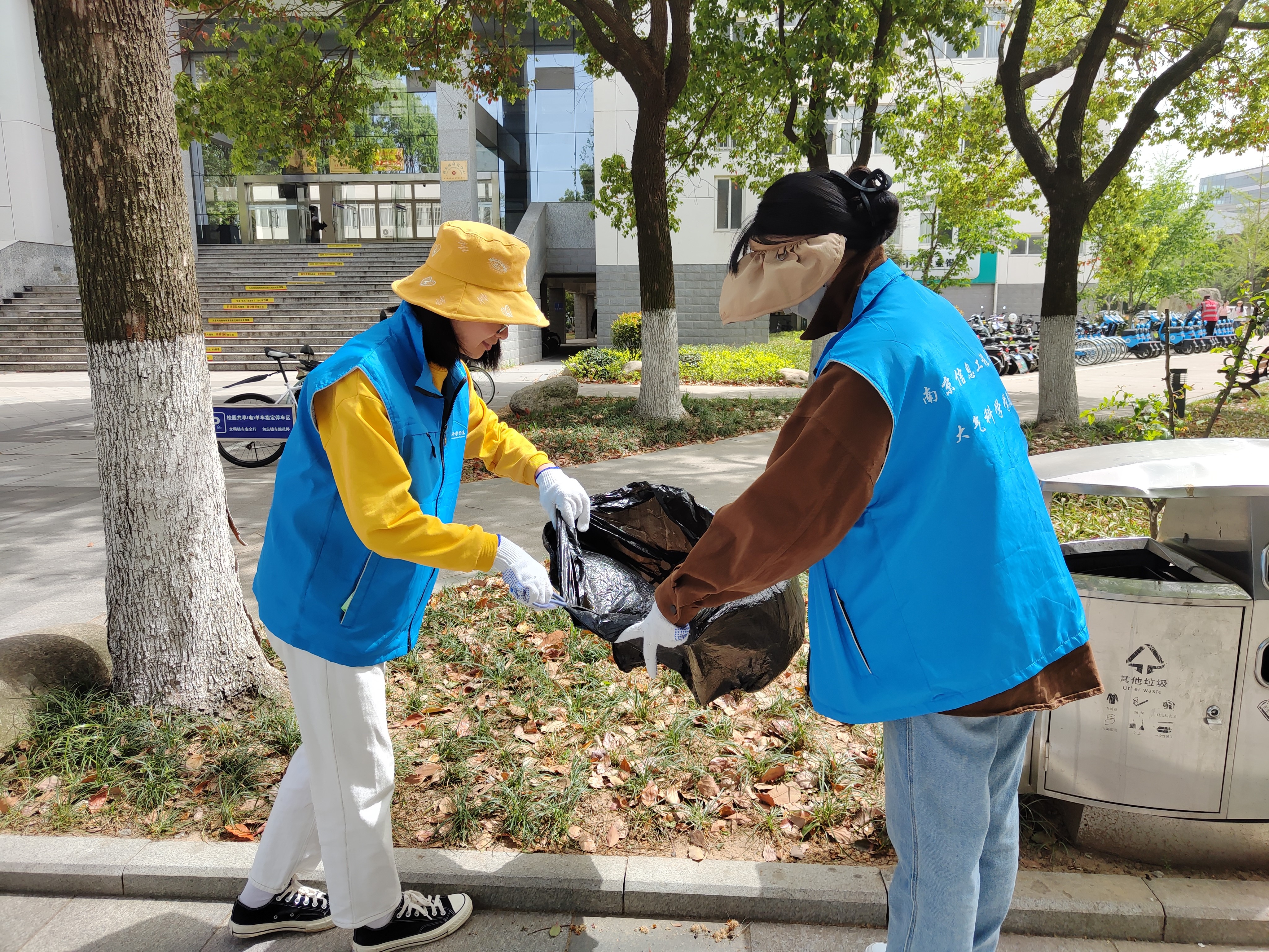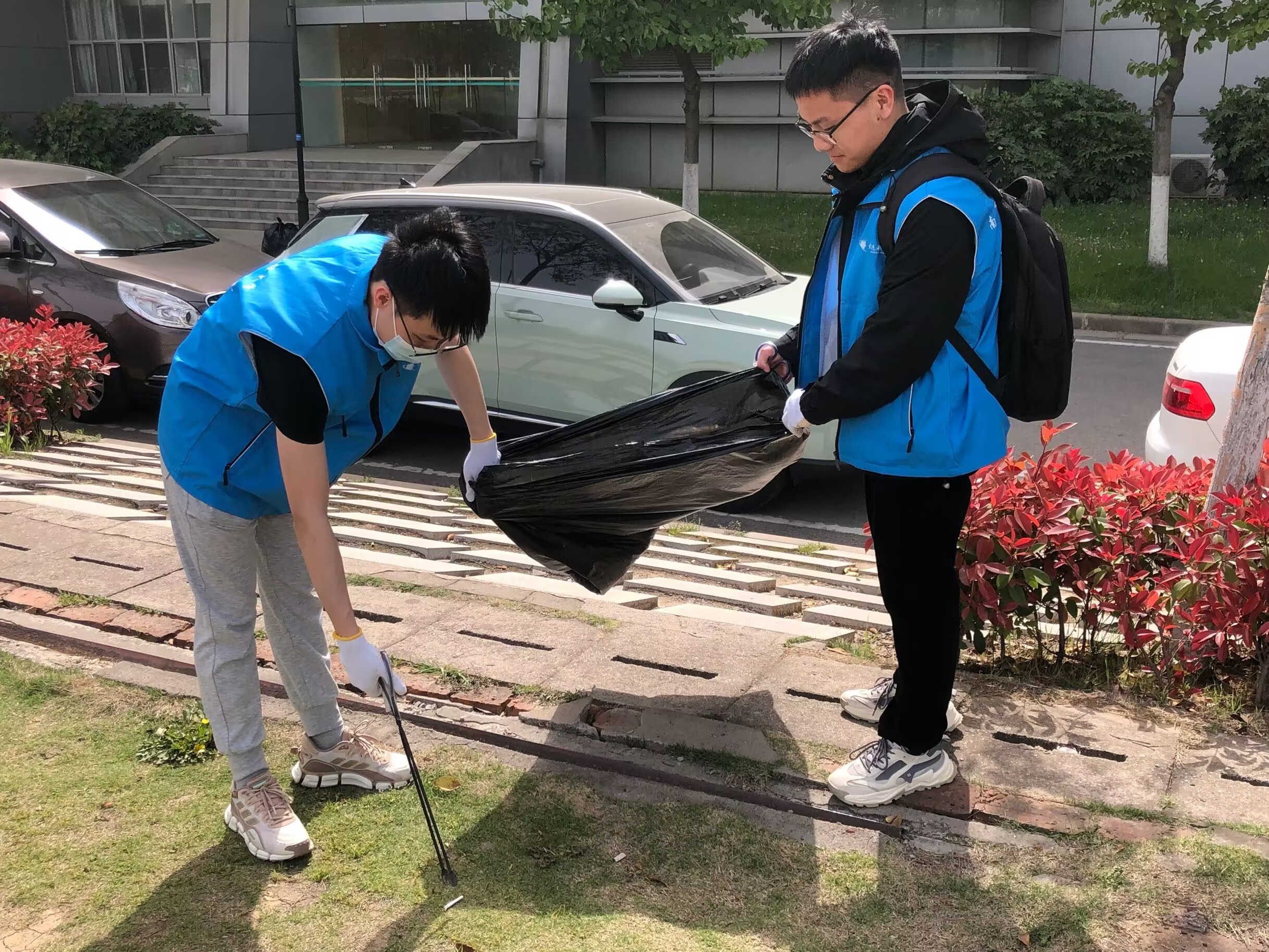 活动伊始,党员同志整装待发,携带垃圾袋、长柄夹、手套等清扫工具分为三支队伍在校园内开展清扫工作。清扫过程中,志愿者们相互配合,捡拾路上、草丛中以及共享单车车筐中的纸屑、塑料瓶等垃圾,细致到每一个角落。随着大家手中的垃圾袋越装越满,校园环境也焕然一新。最后,三支志愿者队伍将捡拾的垃圾投放到校园垃圾站中集中处理。