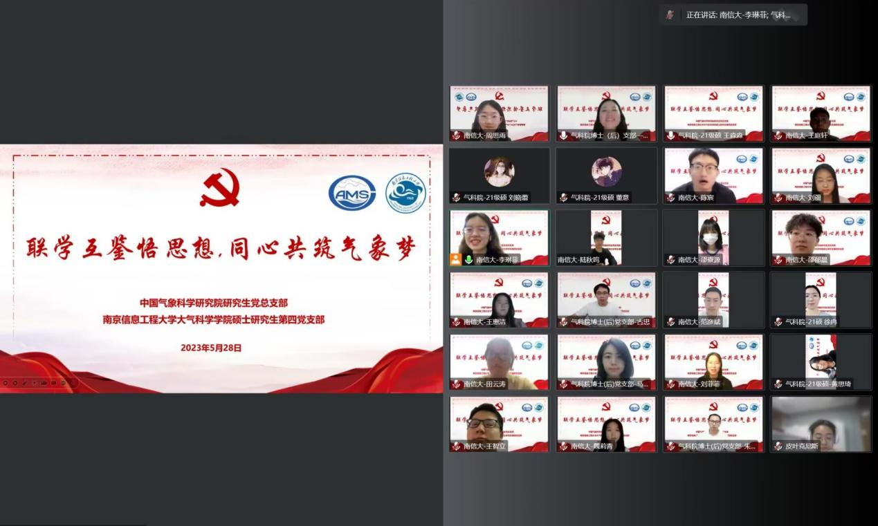 为深入学习贯彻习近平新时代中国特色社会主义思想,以昂扬奋进姿态迎接第七个“全国科技工作者日”到来,推动优势资源共享、实现支部发展建设,引导气象青年坚定理想信念。5月28日,南京信息工程大学大气科学学院硕士研究生第四党支部与中国气象科学研究院研究生党总支部开展以“联学互鉴悟思想,同心共筑气象梦”主题线上联学共建党日活动。