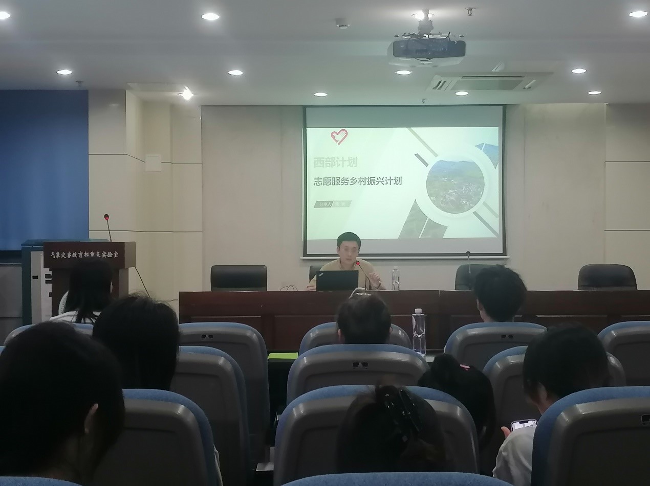 黄欢老师围绕西部计划和乡村振兴计划的由来、志愿服务内容、待遇保障、选拔流程等方面为同学们进行了详细的政策解读。黄欢老师还深情回顾了自己参加研究生支教团的难忘经历,分享了自身参与西部计划的成长感悟和收获,他说:“基层志愿服务对青年的锻炼具有重要意义,用一年的时间做一件一生难忘的事情是难得的经历。”随后,陆秋鸣同学声情并茂地和同学们分享自己去广西支教的经历,介绍了自己在服务地的工作环境与生活条件,鼓励同学们投身基层志愿服务,绽放亮丽青春光彩。在答疑环节中,黄欢老师与陆秋鸣同学就同学们关心的报名条件、服务政策、未来发展等问题进行了耐心解答与深入沟通,鼓励同学们牢记气象服务初心,积极投身国家基层建设事业。
