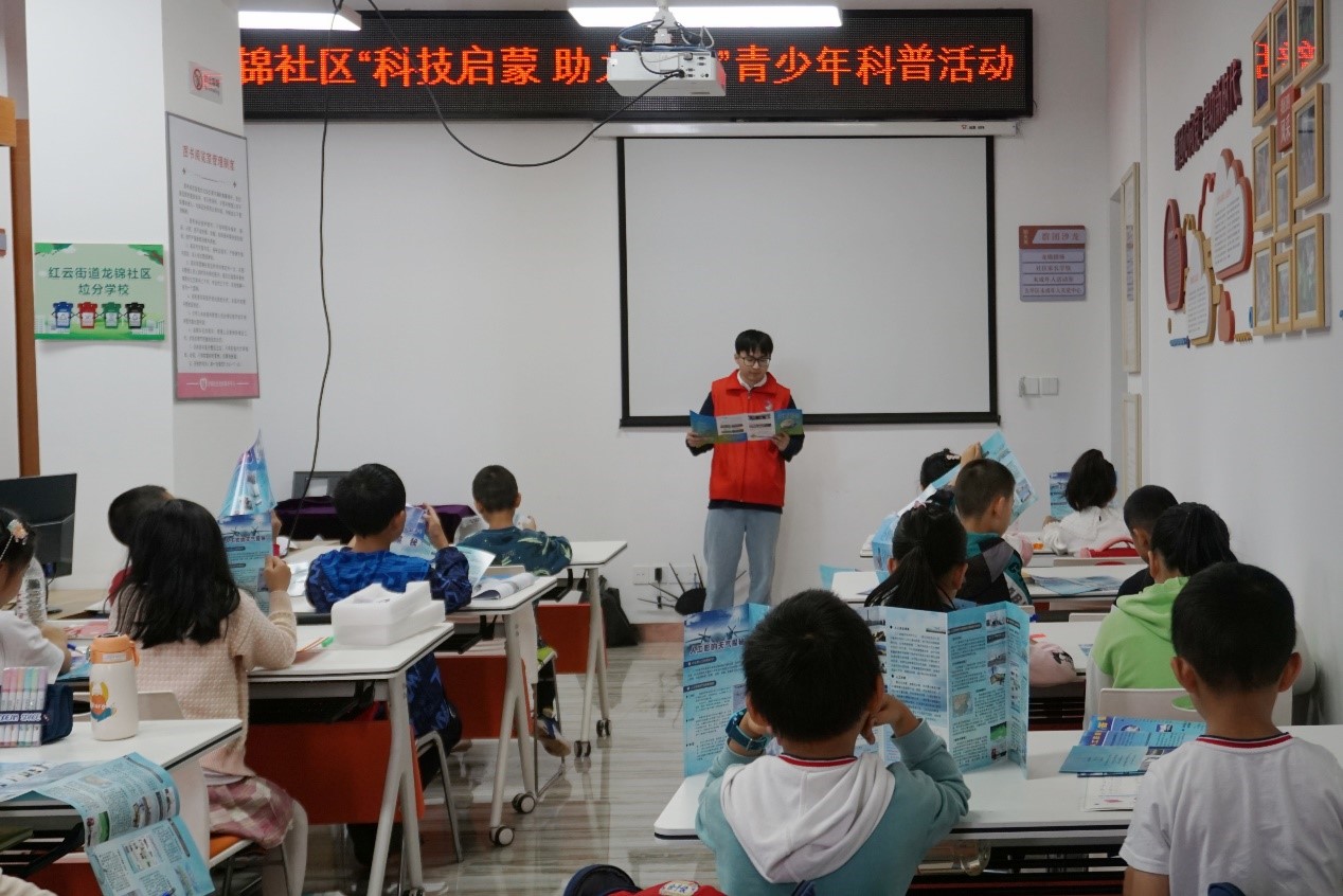 图为团队成员为社区青少年进行气象防灾减灾科普