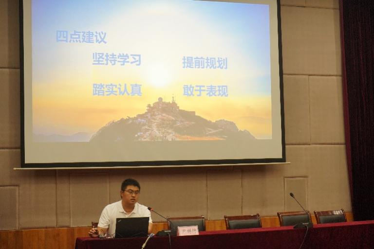 大气科学(气候与资源方向)专业2009级尹祥坤和刘博文两位同学以气象学子的身份向同学们分享了毕业后的工作经历。主讲嘉宾尹祥坤以“根植岱顶观云测天,守护齐鲁敢当奉献”为主题分享了他在泰山之巅的气象故事。他从泰山气象站的历史与发展出发,将自己与泰山的故事娓娓道来,向同学们展示了气象人不论严寒酷暑始终坚守岗位,保障气象数据安全,守护万家平安的钢铁形象。他鼓励同学们养成坚持学习、提前规划的良好习惯,拥有踏实认真、敢于表现的优秀品质。