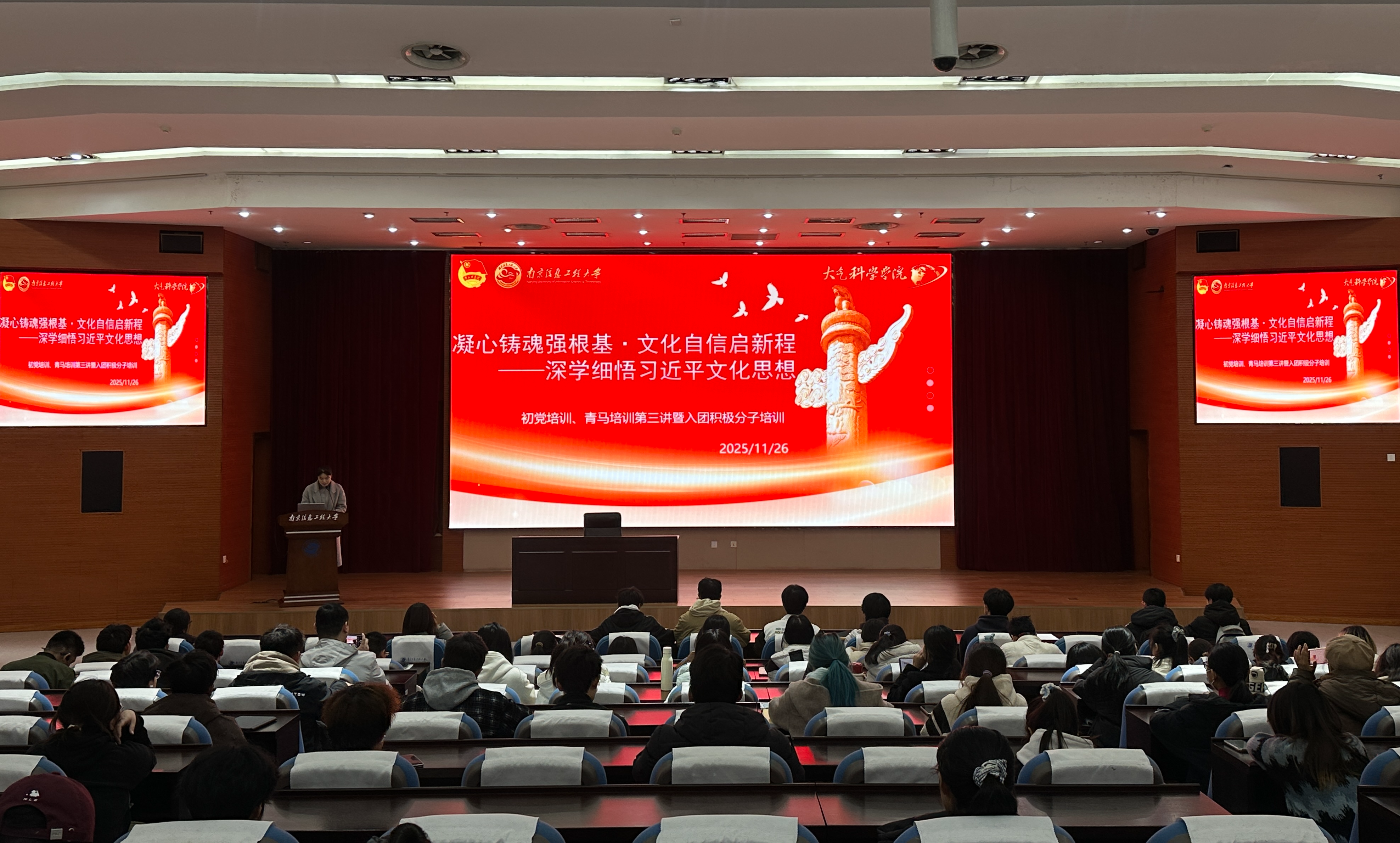 11月26日,大气院在气象楼一楼报告厅举办青马工程培训第三讲暨入团积极分子培训。本次培训以“凝心铸魂强根基·文化自信启新程——深学细悟习近平文化思想”为主题,学院团委副书记董祥如主持,院青马工程学员及入团积极分子参与。