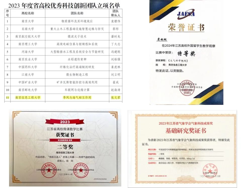 注重“传帮带”和青年教师培养,构建教学科研共同体。2021年《动力气象学》获评江苏省线上一流课程,2023年获批省高校优秀科技创新团队。近三年教师获校级以上教学奖项荣誉共33项。近三年,指导学生获江苏省研究生科研与实践创新计划项目2项,大学生创新创业训练计划项目14项(其中,国家级1项、省级7项、校级6项)。